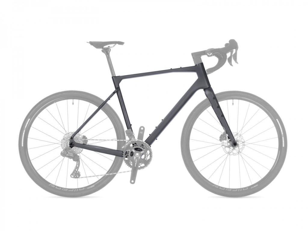 Karbon Toray T700 UD monocoque rám, 1,5“ hlavová trubka, vše vedené vnitřkem rámu od hlavové složení, 12×142 mm zadní stavba, střed. spojka standardu T47, sedlová trubka vrtaná pro sedlovku 27,2 mm, navářka na přesmykač typu „braze on“, podsedlová objímka = rozpěrka v sedlové trubce, UDH koncovka rámu, 9 závit. bodů na rámu, karbon Toray T700 monocoque vidlice včetně rozpěrky do sloupku vidlice, 12×100 mm patky, zužovaný sloupek vidlice 1,5“ tap., hlavové složení FSA No. 55R 1,5" / ACR / STD včetně 30mm podložek, 6 závit. bodů na vidlici, barva šedá matná.