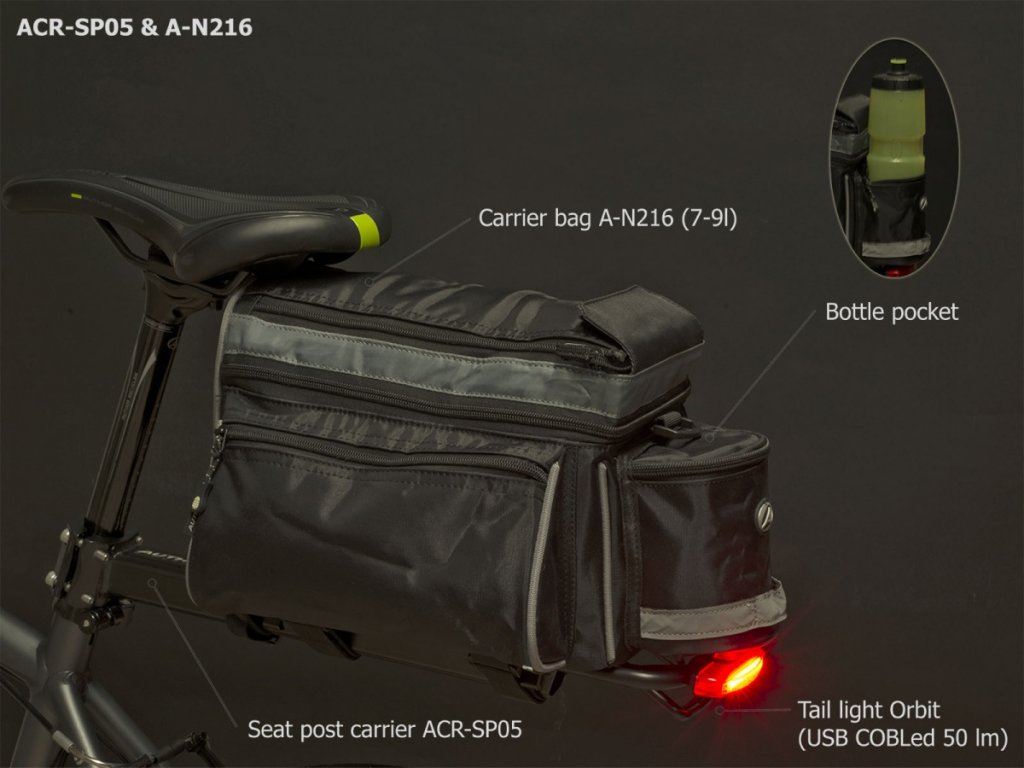 AUTHOR ACR-SP05-Alu je perfektní řešení pro rámy jízdních kol, na které není možno uchytit klasický nosič. Nosič lze rychle a snadno namontovat na sedlovku (NE na karbonovou sedlovku) pomocí čtyř šroubů. Umožní vám převážet brašny na nosič nebo jiné věci na většině jízdních kol.